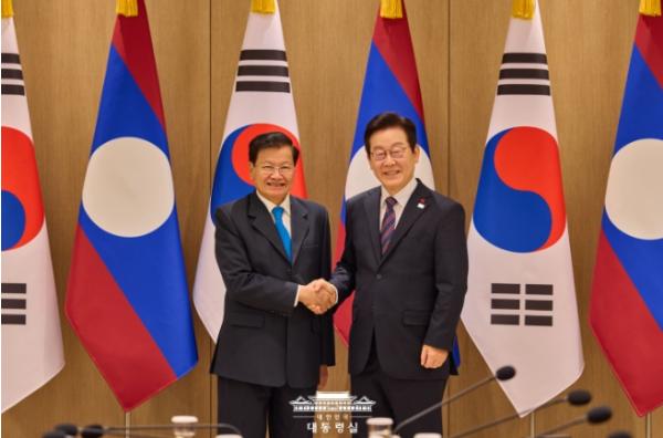 강 대변인은 또 "이 대통령은 라오스가 추진하고 있는 루앙프라방 국제공항 개발사업에 우리나라 기업이 참여할 수 있길 바란다고 했다"며 "라오스의 풍부한 천연자원과 한국 기술력을 바탕으로 희토류 등 핵심 광물의 공급망 구축 등 호혜적 사업이 적극 추진되길 기대한다고 밝혔다"고 전했다.
