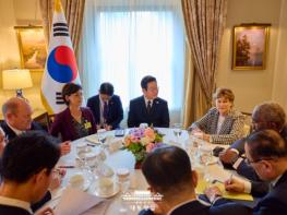 유엔총회 참석을 계기로 방미 중인 이재명 대통령이 22일(현지시간) 첫 번째 일정으로 세계경제포럼(WEF) 의장인 블랙록의 래리 핑크 회장, GIP의 아데바요 오군레시 회장, 김용 전 세계은행 총재와 만났다.