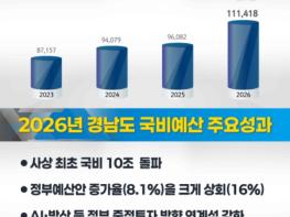 경상남도는 8월 29일 국무회의를 통과한 2026년 정부예산안의 경남도 국비 반영액은 지난해(9조 6,082억 원)보다 1조 5,336억 원이 증가한 11조 1,418억 원이라고 2일 밝혔다.박완수 도지사는 이날 브리핑에