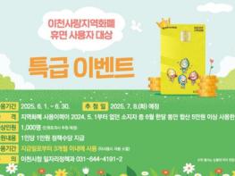 이천시는 지역 내 소비 진작을 위해 이천사랑 지역화폐 휴면 사용자를 대상으로 특급이벤트를 한다고 밝혔다.지역화폐 충전 이력이 2024년 5월 1일부터 한번도 없는 사용자가 다가오는 6월 1일부터 6월 30일