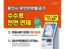 용인특례시는 2026년 1월 1일부터 지역 내 설치된 무인민원발급기에서 발급되는 민원서류 수수료를 전면 면제한다고 25일 밝혔다.이번 조치는 ‘용인시 제증명 등의 수수료 징수 조례’ 일부를 개정해 시민