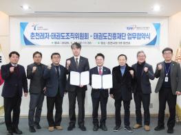 춘천레저·태권도조직위원회(위원장 육동한)와 태권도진흥재단(이사장 김중헌)이 16일 태권도 발전과 국제 경쟁력 강화를 위해 손을 맞잡았다.춘천레저·태권도조직위원회와 태권도진흥재단은 이날 춘천시청