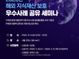 지식재산처는 12월 5일 10시 코엑스(서울시 강남구)에서 ‘2025년 해외 지식재산 보호 우수사례 공유 세미나’를 개최한다. 이번 행사는 2025 대한민국 지식재산대전의 일부 행사로 진행되며, 우리 기업이