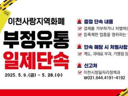 이천시는 경기이천사랑지역상품권의 올바른 사용과 건전한 유통 질서를 확립하기 위해 5월 9일부터 28일까지 지역사랑상품권 부정 유통 근절을 위한 일제 단속을 한다고 밝혔다.이번 일제 단속은 지역사랑상