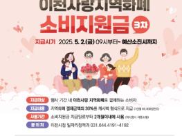 이천시는 ‘가정애(愛)달 기념’ 경기이천사랑 지역화폐 소비지원금을 5월 2일부터 지급한다고 밝혔다.이번 가정애(愛)달 기념 소비지원금은 기존 소비지원금이 결제금액의 20%를 적립금으로 지급했던 것에