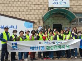 수원시 영통구 매탄1동은 지난 25일, 다가오는 봄을 맞이하여 환경정비를 실시했다. 이날 환경정비에는 공무원, 통장협의회 등 단체원 20여 명이 참여하여 죽은 관목, 화초 및 잡초를 제거하고 화단과 화분