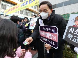조성명 강남구청장이 20일 오전 언북초등학교 정문 앞에서 ‘아동·청소년 범죄 예방을 위한 안전 등굣길 캠페인’을 진행했다.새 학기를 맞아 학교폭력, 도박, 마약 및 딥페이크 등 아동·청소년 대상 범죄로