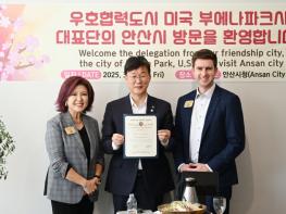 안산시는 이민근 안산시장이 지난 14일 우호 협력 도시인 미국 부에나파크시 대표단을 영접하고 상호 협력 방안을 논의하는 시간을 가졌다고 15일 밝혔다.이날 조이스 안 부에나파크시 시장을 포함한 4명의