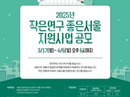 서울연구원은 3.17.~4.6.까지'2025년 작은 연구 좋은서울 지원사업'공모를 진행한다. ‘작은연구 좋은서울 지원사업’은 시민이 직접 서울시정, 일상생활과 관련된 다양한 주제를 발굴하고 생활 현장에서