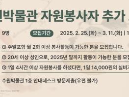 수원박물관이 3월 11일까지 어린이체험실 운영을 도울 자원봉사자 9명을 추가로 모집한다. 선정된 자원봉사자는 2025년 12월 31일까지 활동하게 된다. 하루 4시간 이상 활동하면 1일 실비 1만 4000원을 지급