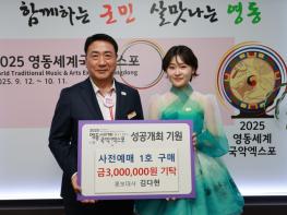 ‘국악트롯요정’ 김다현이 2025영동세계국악엑스포(이하 엑스포)의 입장권 기부행렬에 동참했다. 조직위는 지난 24일 정영철 영동군수(엑스포 공동조직위원장)와 엑스포 홍보대사인 김다현이 300만 원 상