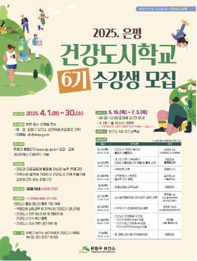 신청은 은평구청 누리집에서 강좌·교육 게시판을 통해 건강도시학교 신청서를 내려받아 작성한 후 담당자 이메일로 제출하거나 신청서를 지참해 은평구보건소 7층 보건위생과로 방문하면 된다.