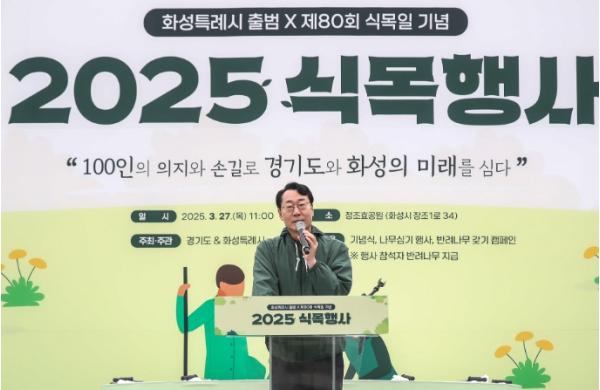 이날 행사는 화성특례시 출범과 제80회 식목일을 기념해 화성특례시와 경기도의 녹색 미래 비전을 공유하는 자리로, ‘100인의 의지와 손길로 경기도와 함께 화성시의 미래를 심다’를 주제로 진행됐다.
