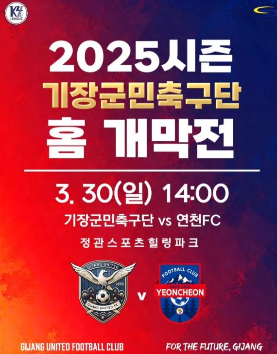 [종합뉴스채널, 최한솔기자] 기장군은 오는 30일 일요일 오후 2시 정관스포츠힐링파크에서 기장군민축구단의 2025년 K4리그 홈 개막전이 열린다고 28일 밝혔다.
