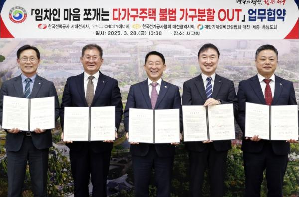[종합뉴스채널, 홍희주기자] 대전 서구는 3월 28일 서구청 갑천누리실에서 다가구주택 불법 가구분할 방지(예방)을 위한 ‘임차인 마음 쪼개는 다가구주택 불법 가구분할 OUT 업무협약’을 체결했다고 밝혔다.