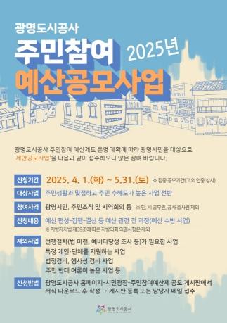 [종합뉴스채널, 최한솔기자] 광명도시공사는 시민 참여 및 소통 확대 방안의 하나로, 2026년도 사업예산에 반영할‘2025년도 주민참여예산 공모사업’을 4월부터 5월까지 고객 및 광명시민들을 대상으로 집중 신청받는다고 밝혔다.