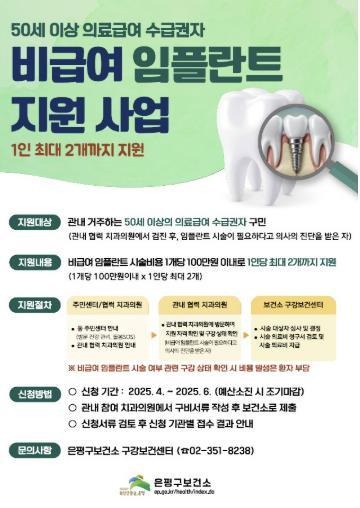 지원 대상은 주민등록상 은평구에 주소를 두고 거주 중인 50세 이상의 의료급여 수급권자로 임플란트 시술이 필요하다고 진단을 받은 자이다. 신청한 순서로 선정되고, 대상자로 결정되면 관내 협력 치과의원에서 임플란트 시술을 받을 수 있다.