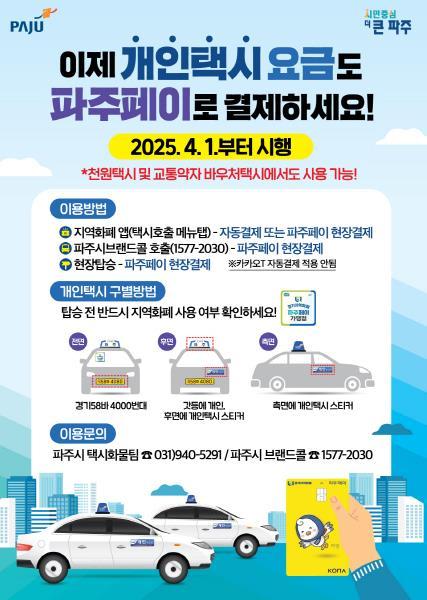[종합뉴스채널, 최한솔기자] 2025년 4월 1일 화요일 9시부터 지역화폐(파주페이)로 개인택시 요금 결제가 가능해진다. 시민들은 경기도 지역화폐(파주페이) 앱이나 브랜드콜을 통해 택시를 호출하거나 길거리에서 택시에 탑승한 후에도 간편하게 지역화폐(파주페이)로 요금을 결제할 수 있다. 단, 카카오티(T) 호출 시 자동결제는 이용이 불가하다.