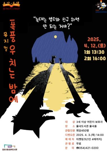 [종합뉴스채널, 김현성기자] 김천시립 율곡도서관은 2025년 제3회 도서관의 날과 제61회 도서관 주간을 맞이하여 오는 4월 12일(토), 오후 1시 30분과 4시 두 차례에 걸쳐 율곡도서관 율곡홀에서 가족이 함께 즐길 수 있는 동명의 그림책 원작 가족 뮤지컬 '폭풍우 치는 밤에'를 개최한다고 밝혔다.
