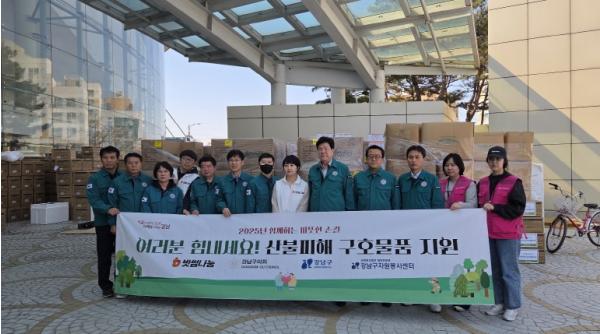 [종합뉴스채널, 박정혜기자] 꿈이 모이는 도시, 미래를 그리는 강남구가 4월 1일 강남구의회, 강남구자원봉사센터, 빗썸나눔과 함께 경북 안동시 체육관을 찾아 트레이닝복 3,000벌과 간식 500세트 등 7,500만원 상당의 긴급 구호물품을 전달했다.