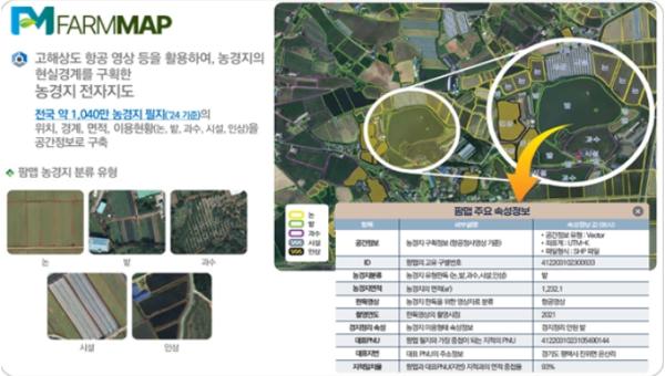 ‘팜맵’은 토지 소유권을 도면에 구획한 지적도와 달리, 고해상도의 항공영상을 활용하여 실제 경작하는 농경지의 경계, 면적 및 속성정보(논, 밭, 과수, 시설 등)를 구축(2014년~)한 농경지 전자지도다.