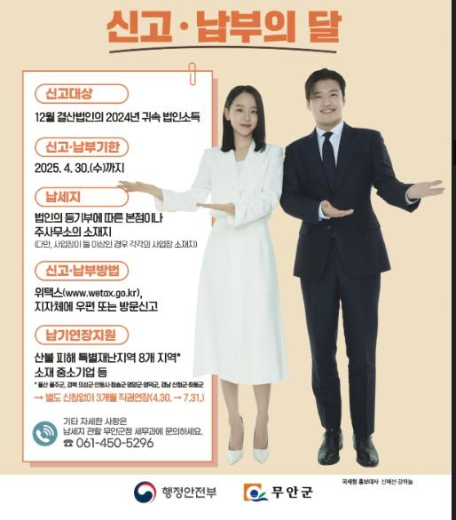 무안군은 납부 기한이 연장된 법인들에 개별 안내를 할 예정이며, 납부 기한만 연장되는 것이므로 30일까지 반드시 절차에 따른 법인지방소득세 신고를 마쳐야 한다.