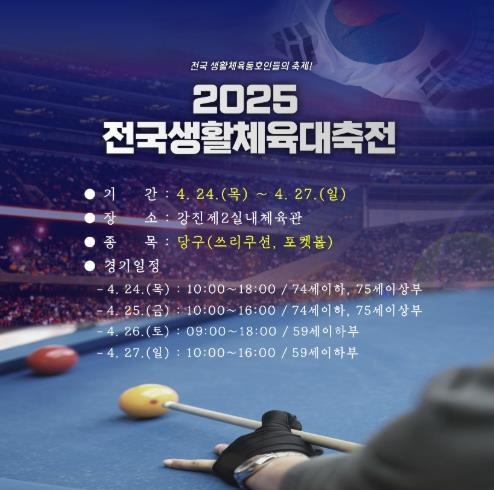 [종합뉴스채널, 최한솔기자] 전국 생활체육인들의 축제인 2025 전국생활체육대축전이 오는 4월 24일부터 4월 27일까지 전남도 20개 시군, 57개 경기장에서 총 41개 종목이 개최된다.