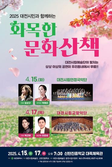 [종합뉴스채널, 김현성기자] 대전시립예술단은 오는 4월 15일과 17일 오후 7시 30분 신탄진중학교 대죽체육관에서 시민과 함께하는 특별한 공연‘화목한 문화산책’을 개최한다.