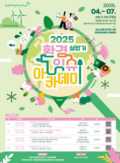 [종합뉴스채널, 박광덕기자] 충청북도교육청 환경교육센터와우에서 4월부터 7월까지 매월 두 번째주 금요일마다 '2025학년도 상반기 환경잇슈아카데미'를 운영한다고 밝혔다.