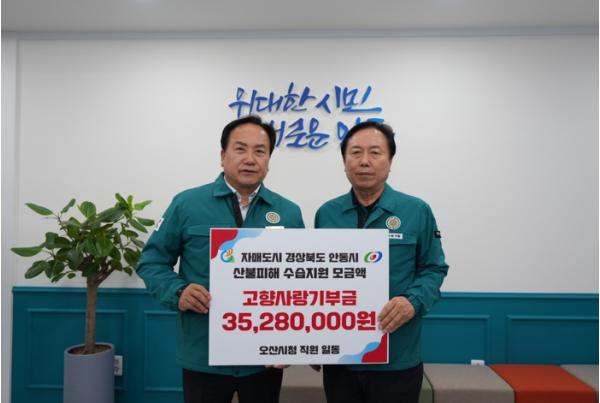 [종합뉴스채널, 최한솔기자] 오산시 최근 대형 산불로 큰 피해를 본 자매도시 경상북도 안동시의 피해 수습을 위한 고향사랑기부금 3천528만 원을 전달했다.