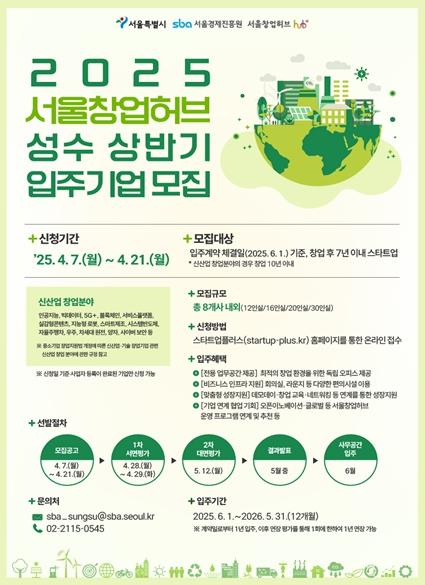 선발된 기업은 서울창업허브 성수에 1년 동안 입주하고, 이후 연장 평가를 통해 최대 2년까지 사무실을 이용할 수 있다.