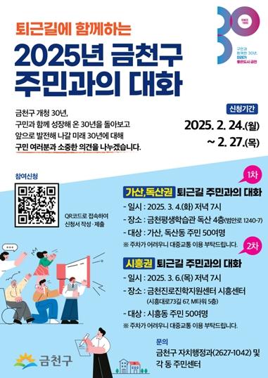 금천구는 오는 3월 4일과 6일, 퇴근길에 주민들과 직접 소통하는 ‘2025년 금천구 주민과의 대화’를 개최한다고 밝혔다.