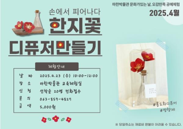 마한박물관 관계자는 "한지꽃의 아름다움과 전통 문화의 가치를 느끼고, 일상 속에서 감성을 채울 수 있는 기회"라며 "박물관이 어렵고 멀게 느껴지지 않도록 앞으로도 누구나 즐길 수 있는 프로그램을 지속적으로 운영하겠다"고 말했다.