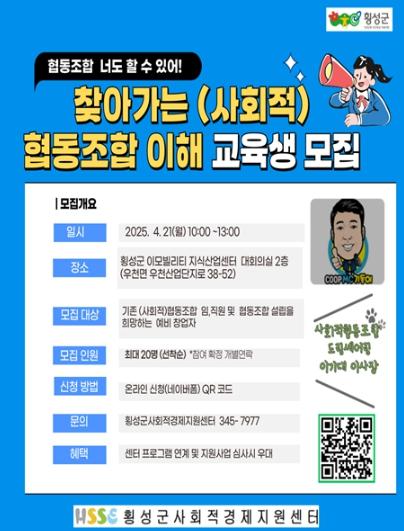 오는 21일에는 협동조합 설립을 희망하는 횡성군민과 협동조합을 운영하고 있는 기존의 임·직원 관계자를 대상으로 ‘찾아가는 (사회적)협동조합 이해 교육’을 진행한다.
