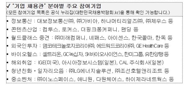 먼저 ‘기업 채용관’은 8개 분야(정보통신, 문화콘텐츠, 월드클래스 중견, 외국인투자, 바이오헬스, 해외취업, 청년친화ㆍ일자리으뜸, 중소벤처)로 구성되며 셀트리온, ㈜LG에너지솔루션, ㈜조선호텔앤리조트, 컴투스, 앰코테크놀로지코리아㈜, CAL㈜, 대보정보통신㈜, ㈜미래컴퍼니, ㈜이노스페이스 등 약 120개 기업이 참여한다.