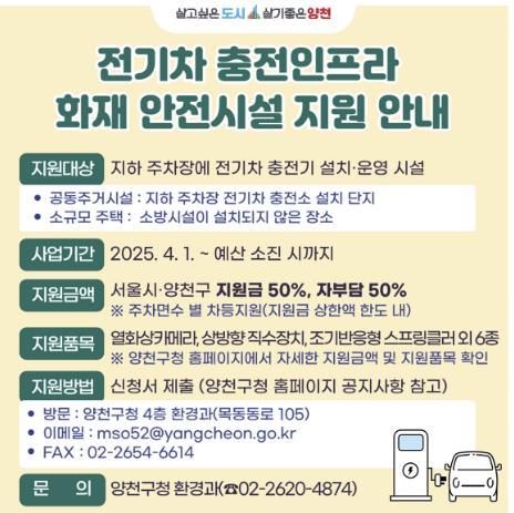 [종합뉴스채널, 박정혜기자] 양천구는 공동주택 지하주차장에서 발생할 수 있는 전기차 화재에 대한 우려를 해소하고 충전시설의 안전을 강화하기 위해 ‘전기차 충전인프라 안전시설 지원’에 나선다고 17일 밝혔다.