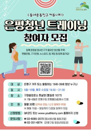 [종합뉴스채널, 박정혜기자] 서울 은평구는 청년들의 건강증진과 지역 관계망 형성을 위한 ‘은평청년 트레이닝’에 참여할 청년을 모집한다고 밝혔다.