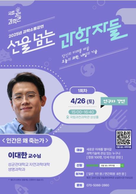 첫 번째 강연(4.26.)은 진화 이론에 근거해 미래 동물의 진화를 상상해보며 현재 지구 생태계를 성찰하는 국립과천과학관의 ‘25년 대표(브랜드) 기획전 ‘미래동물: 대멸종 너머의 생명’과 연계하여 준비했다. 강연에서는 성균관대 생명과학과 이대한 교수가 ‘인간은 왜 죽는가’를 제목으로 인간의 죽음 및 진화 내용과 관련 생명과학(바이오) 기술을 소개할 예정이다.