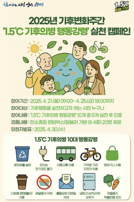 우선 ‘1.5℃ 기후의병 행동강령’ 실천 캠페인 참여 인증 이벤트를 진행한다. ▲분리배출 실천 ▲전기플러그 뽑기 ▲대중교통 이용 ▲가까운 거리 자전거 이용 ▲장바구니 사용 ▲배달 음식 자제 ▲다회용 컵(텀블러) 사용 ▲불필요한 이메일 삭제 ▲냉장고 60% 이하 비우기 ▲제철 음식 먹을 만큼 조리 등 ‘1.5℃ 기후의병 행동강령’ 중 5가지를 실천한 후 오는 25일 오후 6시까지 네이버 폼으로 인증한 시민 중 20명을 추첨해 텀블러 가방, 샴푸 바 등 탄소중립 홍보물품 5종이 담긴 ‘탄소중립 랜덤박스’를 제공한다.
