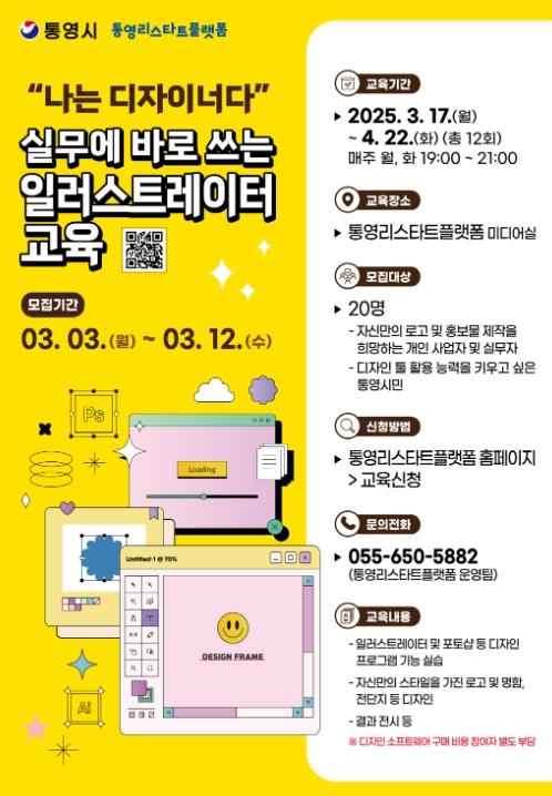통영시는 오는 17일부터 지역 내 1인 기업 창업자의 디자인 업무능력 강화를 위해 ‘실무에 바로쓰는 일러스트레이터 교육’을 진행한다고 전했다.