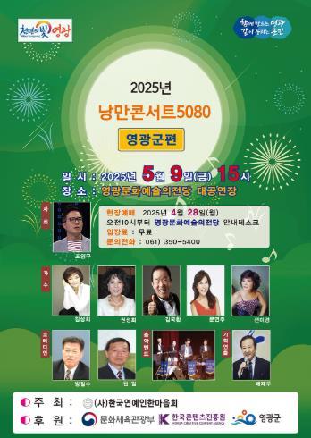 [종합뉴스채널, 김현성기자] 영광군은 오는 5월 9일 오후 3시, 영광문화예술의전당 대공연장에서 어버이날 특별공연 ‘2025년 낭만콘서트 5080’을 개최한다.