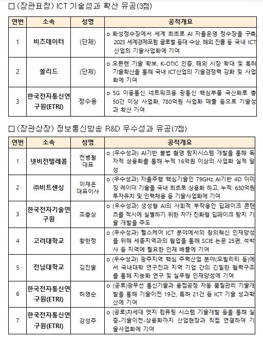 또한, 정보통신·방송 연구개발사업에서 우수성과를 창출하고 기술사업화에 기여한 공로가 큰 기업과 연구기관의 전문가를 격려하기 위한 시상식도 진행된다. 전병철 넷비전텔레콤 대표 등 정보통신방송 연구개발 분야에서 우수 성과를 창출한 7인은 장관상을, 정수용 한국전자통신연구원 책임연구원, 비즈데이터, ㈜쏠리드는 정보통신 기술성과 확산 유공을 인정받아 장관표창을 수여 받는다.