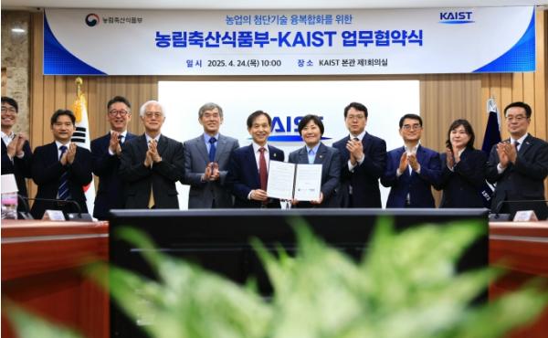 [종합뉴스채널, 최한수기자] 농림축산식품부는 과학기술특성화대학인 한국과학기술원(KAIST, 총장 이광형)와 협력하여 AI, 첨단바이오 등 농업부문 기술혁신을 선도하고 미래농업을 이끌 융합형 인재 양성, 기술창업 활성화를 위해 4월 24일 업무협약을 체결했다.