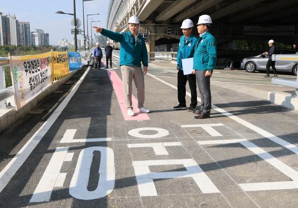 이날 오 구청장은 현장에서 공사관계자로부터 진행 상황에 대한 설명을 들은 후 현장 시설물과 노면 상태 등을 꼼꼼히 살폈다.