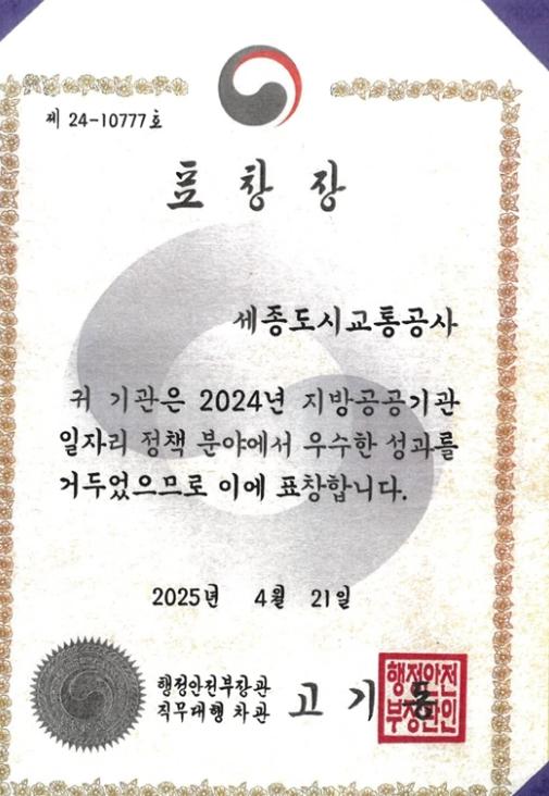 [종합뉴스채널, 신철훈기자] 세종도시교통공사는 행정안전부가 주관한 ‘지방 공공기관 일자리 정책 우수기관’에 선정되어 장관 표창을 수상했다고 24일 밝혔다.