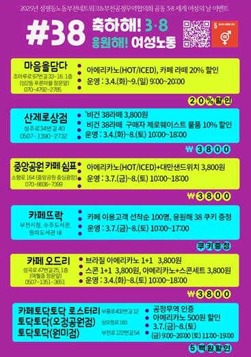 한편 3월 4일~9일까지 부천지역 공정무역 카페 10개소에서는 ‘3.8 세계 여성의 날’을 축하하는 의미로 커피 할인, 쿠키 증정 등 이벤트를 진행한다. 카페별 이벤트 일정이나 할인율은 상이하다.
