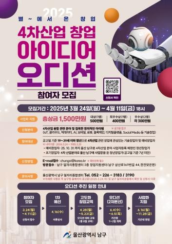 남구 관계자는 “참여자들이 가지고 있는 4차산업 창업아이디어들은 세상을 변화시킬 수 있는 잠재력을 충분히 가지고 있는 창업아이템으로 수상의 영예와 성공적인 기술 창업의 꿈을 함께 이룰 수 있도록 오디션 대비 고도화 창업 교육에 성실히 참여해 자신의 역량을 강화해 보길 바란다”고 전했다.