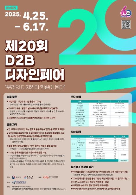 [종합뉴스채널, 최한수기자] 특허청은 4월 25일부터 신제품에 대한 디자인 아이디어가 필요한 기업에 우수한 디자인 발굴과 사업화를 지원하는 ‘2025 D2B(Design to Business) 디자인 페어’에 ❶참여할 기업 모집 및 ❷청년 디자이너들의 출품작 모집에 들어간다고 밝혔다.