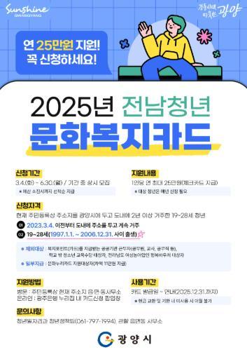 광양시는 3월 4일부터 6월 30일까지 2025년 ‘전남청년 문화복지카드’ 지원 대상자를 모집한다고 밝혔다.