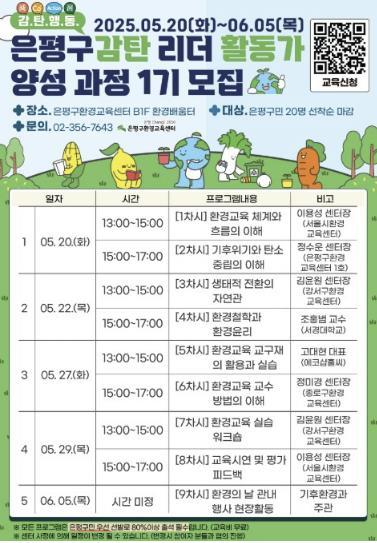 모집 대상은 탄소중립 실천 의지가 있는 은평구민으로, 선착순 20명이다. 교육은 공공형 은평구환경교육센터(은평 ChangE 2050)에서 진행되며, 교육 기간은 내달 20일부터 29일까지 총 8회차가 열린다.